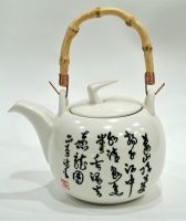 Чайник "Иероглифы" 800 мл фарфор с крышкой и металлическим ситом. Ручка из бамбука.